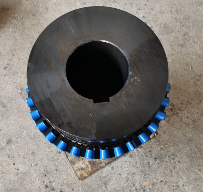 蛇形彈簧聯(lián)軸器其主要結(jié)構(gòu)是由兩個(gè)半聯(lián)軸節(jié),兩個(gè)半外罩,兩個(gè)密封圈及蛇形彈簧片組成。它是靠蛇簧嵌入兩半聯(lián)軸節(jié)的齒槽內(nèi)來傳遞扭矩,聯(lián)軸器以蛇形彈簧片嵌入兩個(gè)半聯(lián)軸節(jié)的齒槽內(nèi),來實(shí)現(xiàn)主動(dòng)軸與從動(dòng)軸的鏈接。運(yùn)轉(zhuǎn)時(shí),是靠主動(dòng)端齒面對(duì)蛇簧的軸向作用力帶動(dòng)從動(dòng)端,來傳遞扭矩,如此在很大程度上避免了共振現(xiàn)象發(fā)生,且簧片在傳遞扭矩時(shí)所產(chǎn)生的彈性變量,使機(jī)械系統(tǒng)能獲得較好的減振效果,其平均減振率達(dá)36%以上。